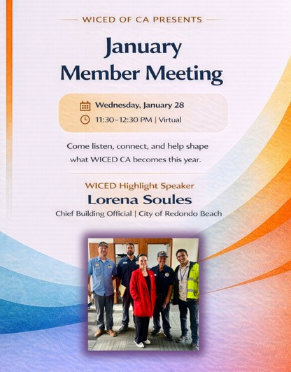 Our mission at WICED of California is to champion the advancement of women in all fields of code enforcement and development by facilitating professional growth, fostering leadership, and promoting a diverse and inclusive workforce that upholds the highest standards of code compliance throughout the state.